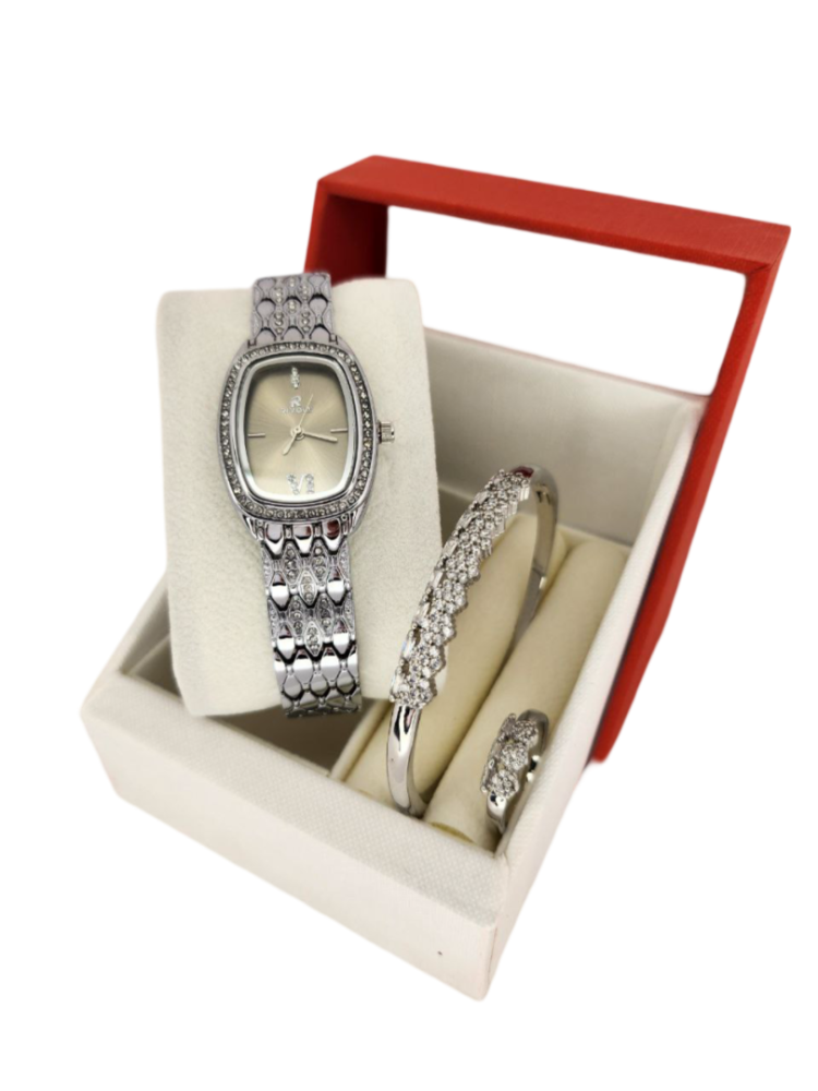 تألقي بإطلالتك الفريدة بساعة عصرية بحركة كوارتز مقاومة للماء بميناء يعطي إيحاء بالأناقة والفخامة، بالإضافة الى طقم من سوارة و خاتم التي تناسب اطلالتك الرسمية والعملية.