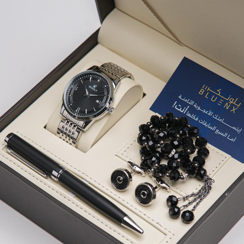 طقم رجالي ماركة RIVOLY ستيل باللون الفضي بشكل دائري عصري وجذاب و بميناء باللون الاسود
